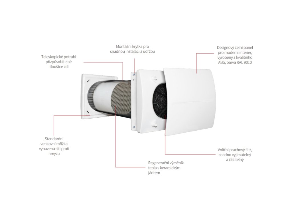 Lokální rekuperace - ⌀ 150 mm (průměr), průtok 7-60 m3/h, nízká spotřeba energie, dálkový ovladač (součástí balení), kuličková ložiska, 3 rychlosti + noční režim, EC motor, nastavitelné potrubí (délka 300 - 570 mm), energetická třída A, spotřeba max. 3,5 W, účinnost až 74 %, barva bílá, vestavěný prachový filtr, užívané do (domů, bytů - ložnice, obývacího pokoje, koupelny), hlučnost 37 db(A), keramický tepelný výměník, voděodolnost IP X4, rozměry 570 × 218 mm (Š×V), hmotnost 3,9 kg