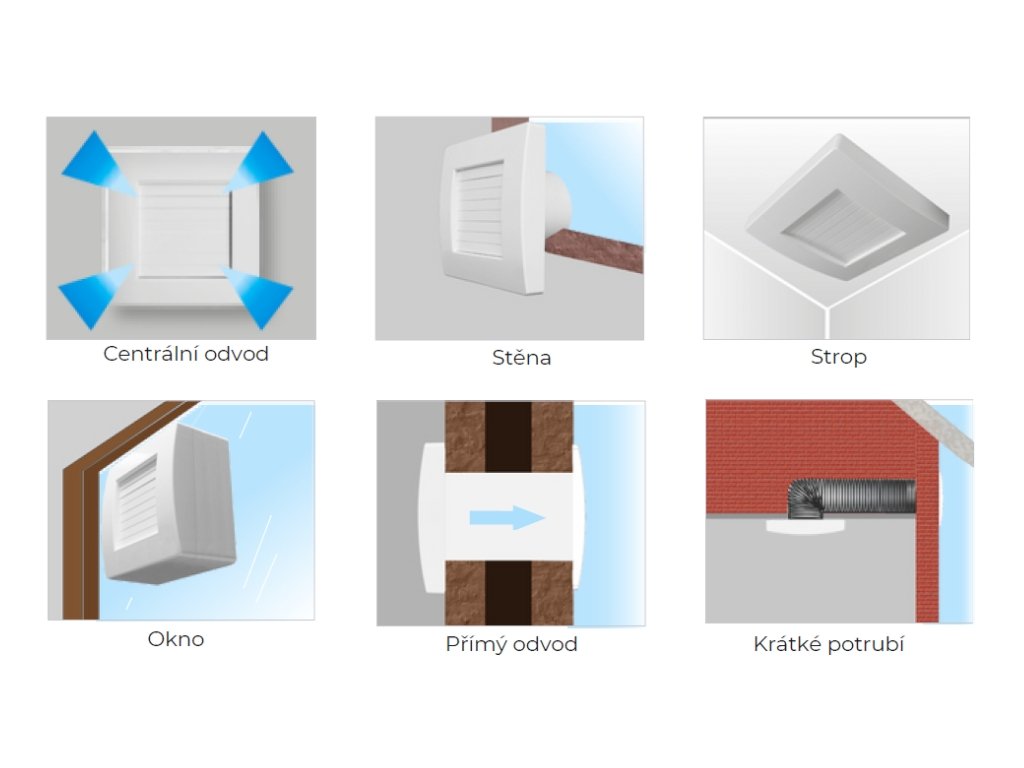 S potřebným příslušenstvím je možné ventilátor instalovat na stěnu/panel, na strop nebo do okna.