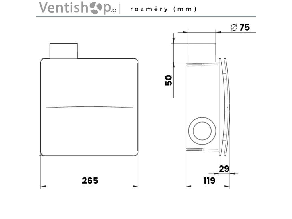 Koupelnový radiální ventilátor - ⌀ 80 mm (průměr potrubí), max. průtok 103 m3/h, krytí IP X5, radiální konstrukce, hlučnost 22/30 dB(A) (dle rychlosti), statický tlak 164/260 Pa (dle rychlosti), pro zapuštěnou montáž, materiál pláště ABS plast, těsná zpětná klapka, akustická pěna, kuličková ložiska, dvourychlostní, dvojitá izolace, příkon 19/29 W, splňuje EN60335-2-80 + EMC / DIN 18017-3, rozměry 265 × 265 mm (Š×V), hmotnost 2,25 kg