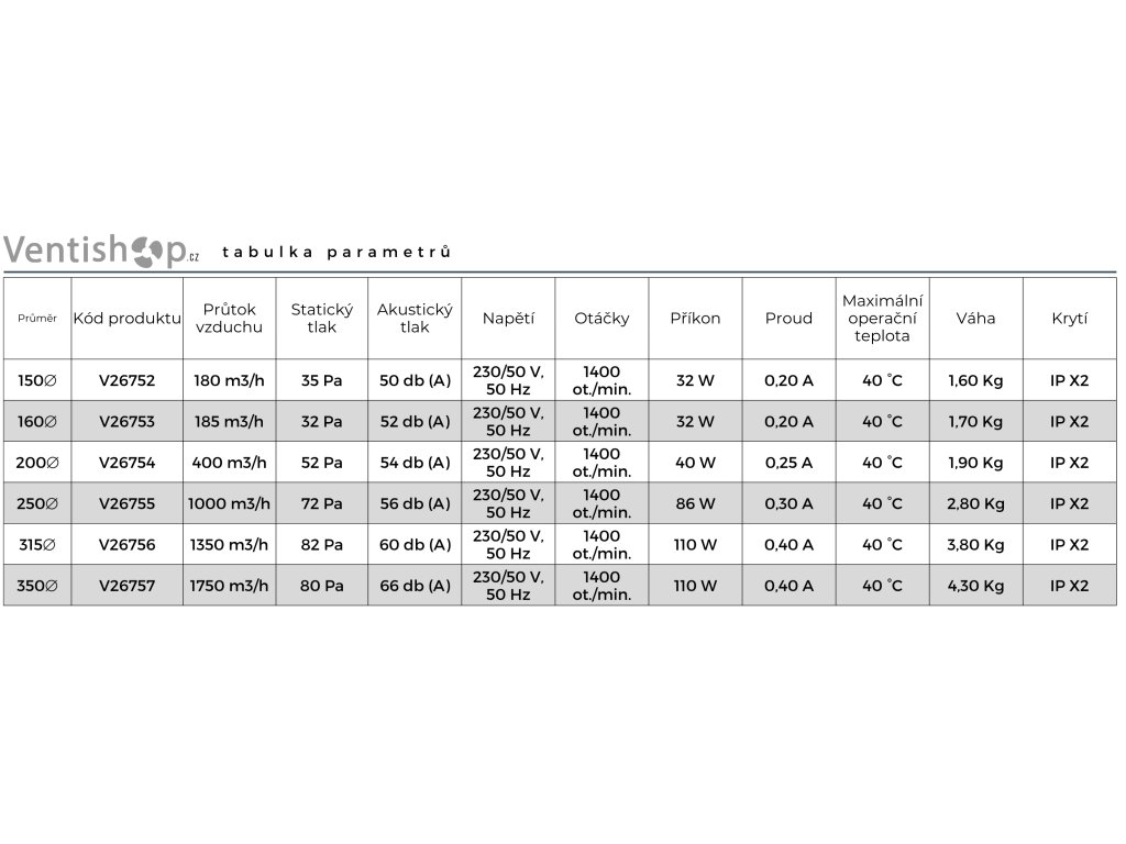 Nízkotlaký potrubní ventilátor, vhodný pro průměr potrubí 350, 355 mm. Díky kvalitní ocelové konstrukci s pozinkovanou vrstvou a průtokem 1750 m3/h je vhodný do obchodů, pěstíren, barů, kaváren, restaurací či dalších komerčních, průmyslových prostor. Dlouhodobě spolehlivému chodu ventilátoru napomáhá zpracování konstrukce, které ventilátor chrání vůči kapající vodě i při naklonění do úhlu až 15° (stupeň krytí IPX2).