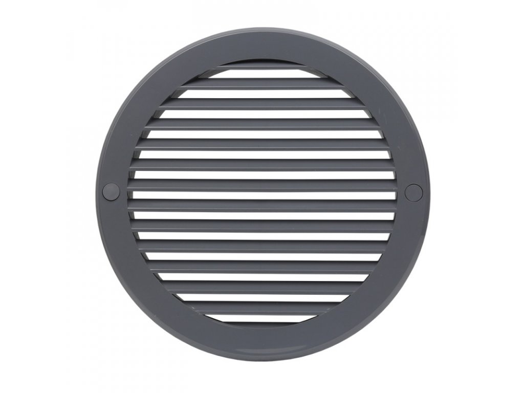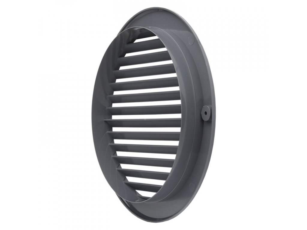 Kruhová protidešťová větrací mřížka - ⌀ 125 mm (průměr), barva šedá, odolný plast, s přírubou, s pevnými lamely, užívané pro (fasádu, zdivo, domy, průmyslové objekty, interiér - kuchyně, koupelny, WC atd...), hmotnost 0,05 kg