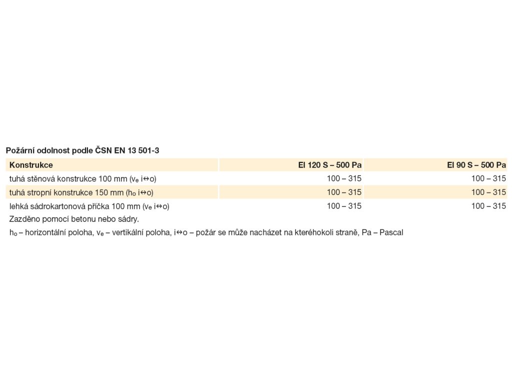 Označení CE dle certifikace EN 15650, klasifikace podle EN 13 501-3 je EI 90/120 S. Zkoušeno podle normy ČSN EN 1366-2 při 500 Pa.