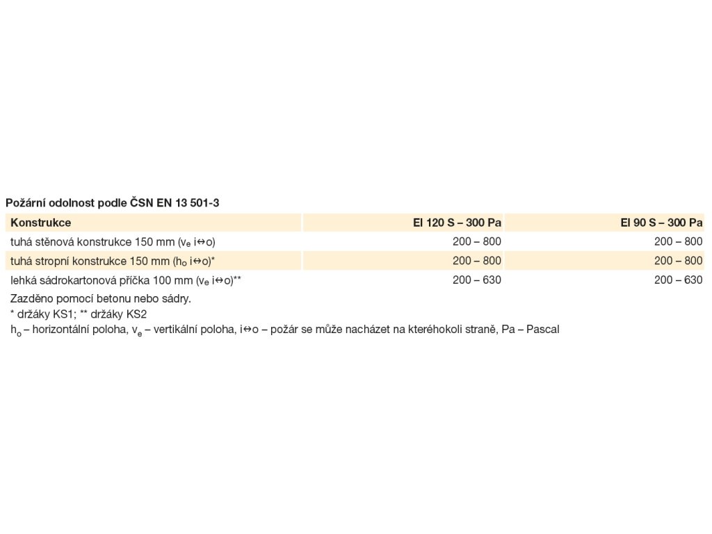 Označení CE dle certifikace EN 15650, klasifikace podle EN 13 501-3 je EI 90/120 S. Zkoušeno podle normy ČSN EN 1366-2 při 500 Pa.