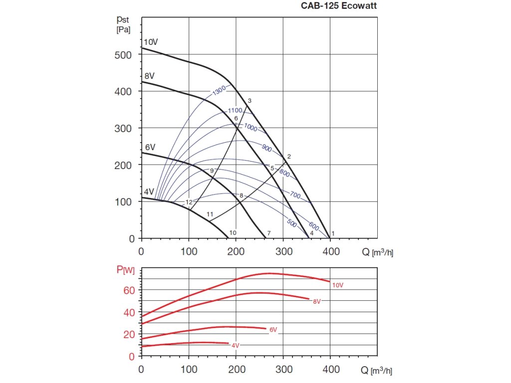 Ventilátor je vybaven vestavěným ovladačem přednastaveným na provoz v režimu automatické regulace na konstantní tlak v potrubí (dle velikosti ventilátoru – CAB-125 100 Pa, CAB-150 až CAB-315 150 Pa, CAB-355 a CAB-400 200 Pa). Digitální ovladač PROSYS Ecowatt (není součástí dodávky) umožňuje 4 základní režimy ovládání – automatická regulace na konstantní tlak v potrubí, plynulá automatická regulace na konstantní průtok vzduchu (mimo CAB-125), proporcionální režim nebo režim větrání se 2 přepínatelnými pracovními charakteristikami min./max. Je možné připojení signálu z externího zařízení (čidla CO2, teploty a relativní vlhkosti), externího tlakového čidla s převodníkem a výstupem 0–10 V nebo 4–20 mA. Ovladačem PROSYS Ecowatt lze regulovat až 32 ventilátorů s různým nastavením v jedné síti. Digitální ovladač PROSYS Ecowatt v kombinaci s modulem TIMER RTC Ecowatt (není součástí dodávky) umožňuje nastavení až 3 časových programů a prázdninového provozu.