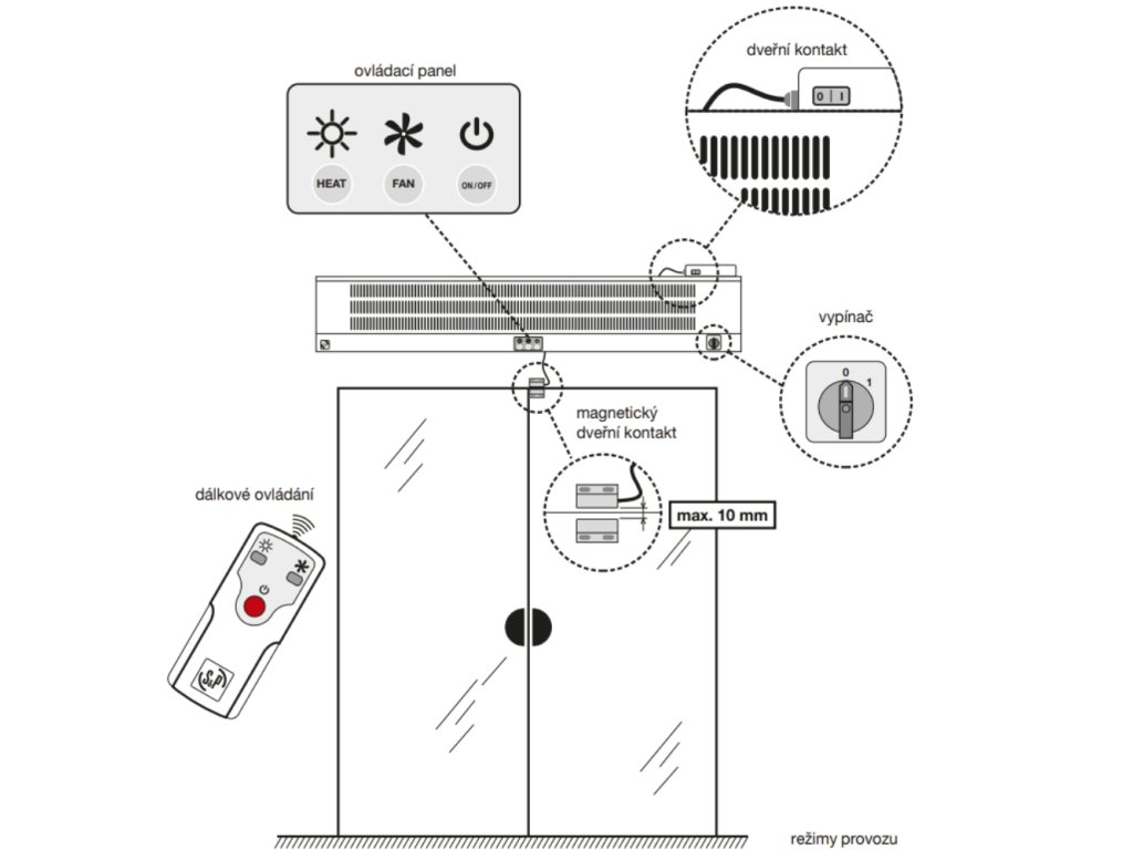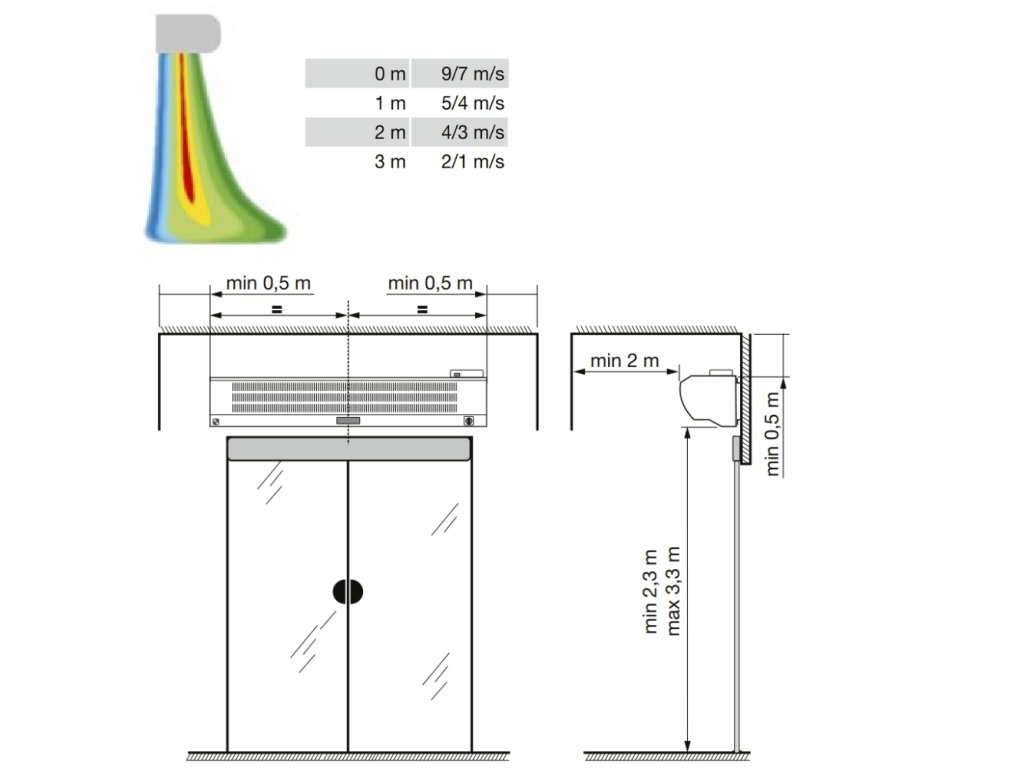 Vzduchová clona - max. příkon 3,715 kW, max. výška 3,3 m, hlučnost 54,2 dB, elektrický ohřev, barva bílá, délka clony 900 mm, z galvanizované oceli, max. průtok 1400 m³/h, napětí 220 - 240 V, ventilátor - tangenciální, počet rychlostí 2, krytí motoru IP 20, rychlost proudu 9 m/s, barva bílá (RAL 9003), umístění (do - večerky / obchodu / komerčních prostor / garáží / menších či středně velkých provozoven), vyvážené oběžné kolo, na strop / stěnu, proud 17,5 A, součástí balení (dálkové ovládání i dveřní čidlo), rozměry 900 × 270 mm (Š×V), hmotnost 17 kg