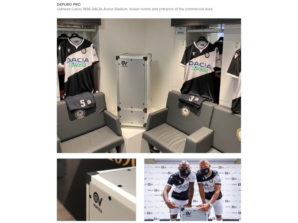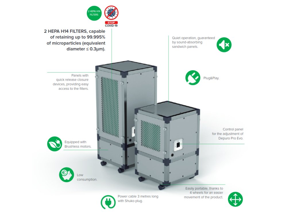 Profesionální čističky vzduchu Vortice DEPURO PRO pro komerční a průmyslové užití poskytují vysoce účinnou filtraci pomocí dvou filtrů HEPA H14 nejvyšší třídy, schopných zachytit nečistoty jako pyl, spóry, kapičky a mikročástice, které jsou potenciálními nosiči virů (včetně COVID-19) a bakterií, čímž dochází ke značnému snížení rizika vzniku alergií, astmatu, respiračních problémů a infekcí. Navíc modely DEPURO PRO EVO jsou vybaveny i fotokatalytickým modulem, který zajistí dezinfekci vzduchu (eliminací většiny bakterií, virů, zápachů, plísní a alergenů přítomných v ovzduší). Efektivita modulu je certifikována Univerzitou v Miláně ve spolupráci s Oddělením biomedicínských klinických věd Luigi Sacco nemocnici v Miláně.