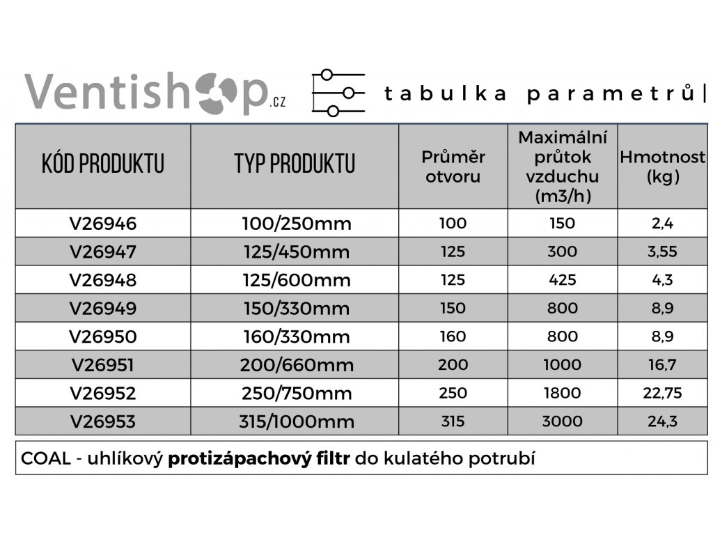 Filtr s aktivním uhlím do kulatého potrubí. Účinně eliminuje zápach z domácích i průmyslových prostor. Vhodný do potrubí o průměru 100 mm. Filtr je možné použít ve vzduchovodu s max. průtokem vzduchu 150 m3/h. Díky působení aktivního uhlí jednoduše odfiltruje pach ze vzduchu, který skrze něj prochází. Díky těmto vlastnostem je vhodný do restauračních kuchyní, kiosků, pěstebních stanů, ale také průmyslových prostor - lakoven, nemocnic a dalších prostor, v nichž je potřeba pach filtrovat.