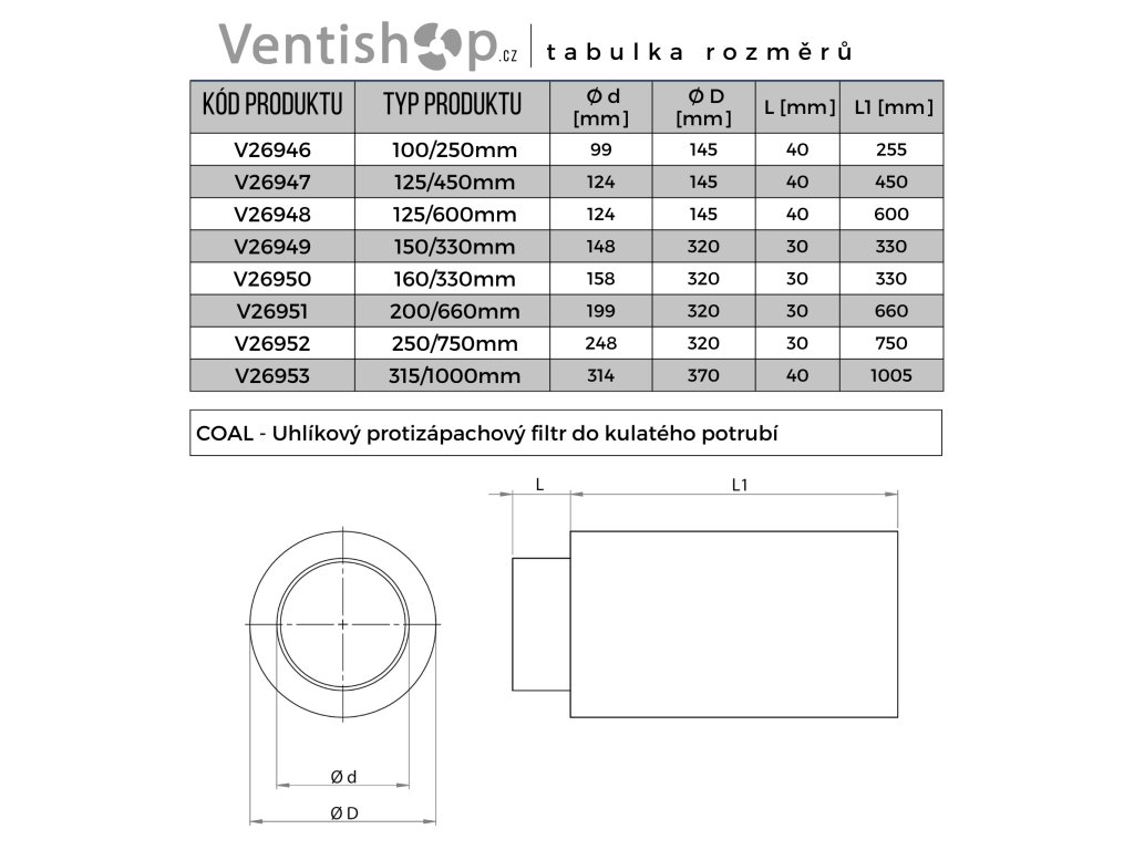 Filtr s aktivním uhlím do kulatého potrubí. Účinně eliminuje zápach z domácích i průmyslových prostor. Vhodný do potrubí o průměru 160 mm. Filtr je možné použít ve vzduchovodu s max. průtokem vzduchu 800 m3/h. Díky působení aktivního uhlí jednoduše odfiltruje pach ze vzduchu, který skrze něj prochází. Díky těmto vlastnostem je vhodný do restauračních kuchyní, kiosků, pěstebních stanů, ale také průmyslových prostor - lakoven, nemocnic a dalších prostor, v nichž je potřeba pach filtrovat.