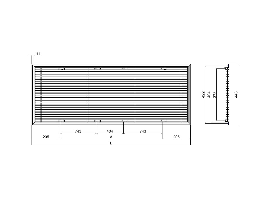 podhledové mřížky pro clony COR FT 3 barevné možnosti - bílá RAL 9016, černá RAL 9005 a přírodní elox mřížka COR-FT 2000 je určena k montáži spolu s 2 clonami COR-FT 1000 mřížku je nutno objednat samostatně, prodává se pouze jako příslušenství ke clonám COR FTParametry