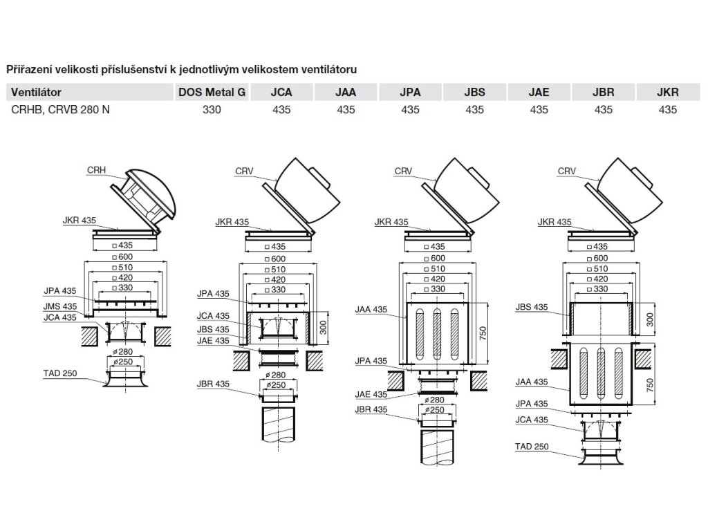 tlumič hluku pro připevnění na plochou střechu velikosti příslušenství a připevňovacích šroubů 300 – M10 (D=13) 435 až 630 – M12 (D=15) 710 do 1100 – M14 (D=18)