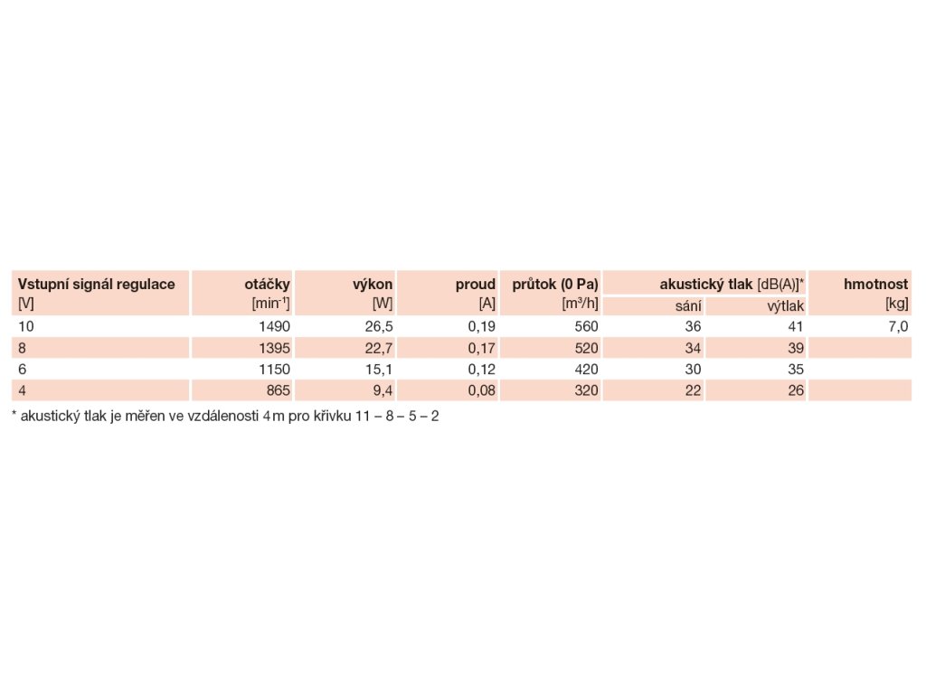 Motor je stejnosměrný, speciálně vyvinutý EC motor s vnějším rotorem pro napájení 230 V/50 Hz. Motory jsou sériově vybaveny termopojistkou. Izolace motoru je třídy F. Trvalá pracovní teplota –40 až +40 °C. Ložiska mají tukovou náplň na dobu životnosti. Krytí IP44.