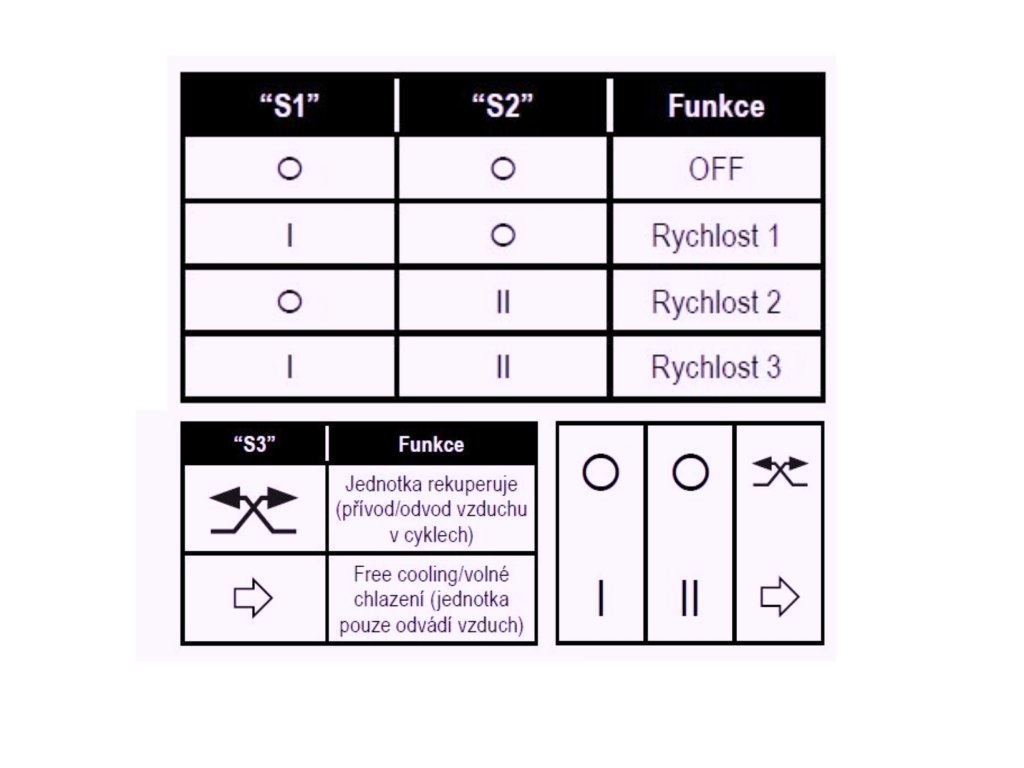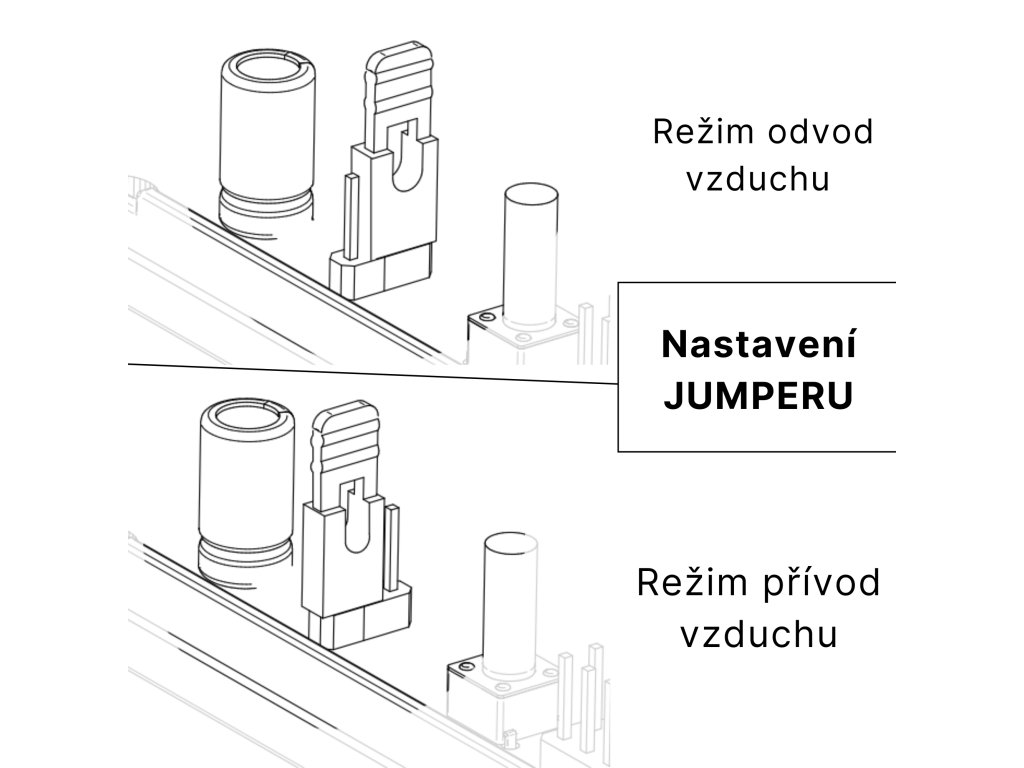 - Režim "Volné chlazení" (Freecooling): Když zapnete tento režim pomocí spínače S3, jednotka přestane střídat přívod a odvod vzduchu. Místo toho bude buď jen odvětrávat vzduch ven, nebo jen přivádět vzduch z venku. (Nastavení se provádí pomocí jumperu)