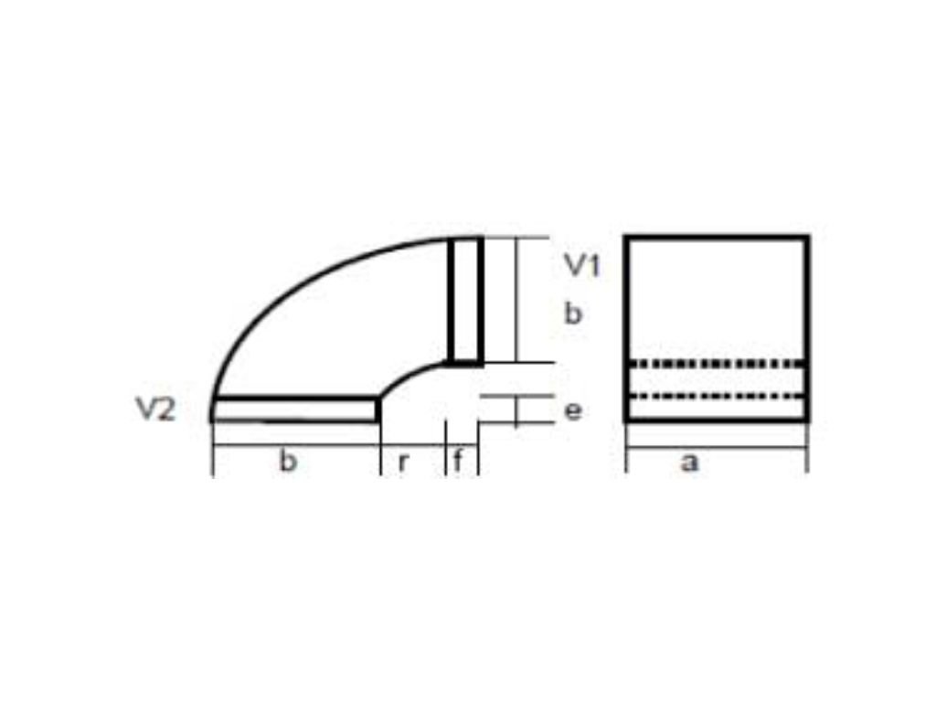 Čtyřhranný symetrický 90° oblouk s rozměrem 400 x 400 mm určený pro hranaté vzduchotechnické potrubí (trouby). Potrubí je vyrobeno z pozinkovaného ocelového plechu tloušťky 0,6 mm. Potrubí je určeno pro přepravu čistého vzduchu mezi aktivními VZT prvky a koncovými prvky. Využívá se především v komerčních a průmyslových objektech a všude tam, kde není možné umístit kruhové potrubí.