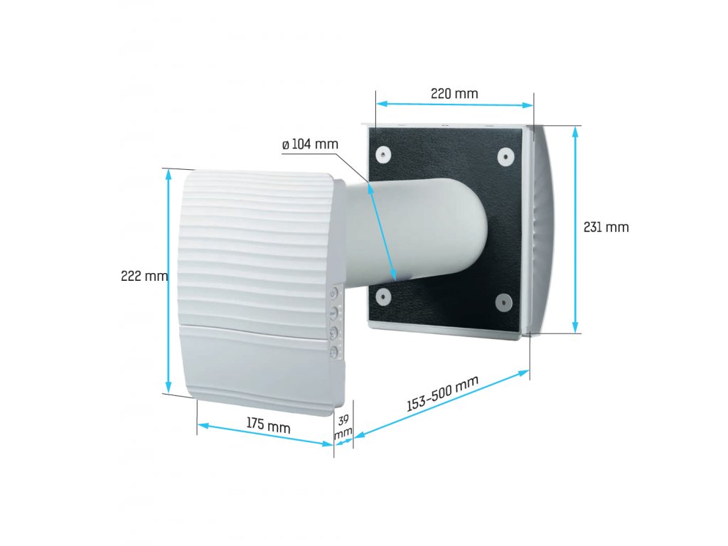 Na jednotce naleznete vnější hliníkový kryt a keramický tepelný výměník. Vzduch je odváděn/přiváděn kruhovým teleskopickým kanálem o délce 155-530 mm. Jednotka je tak uzpůsobena na výkonnou rekuperaci místností.