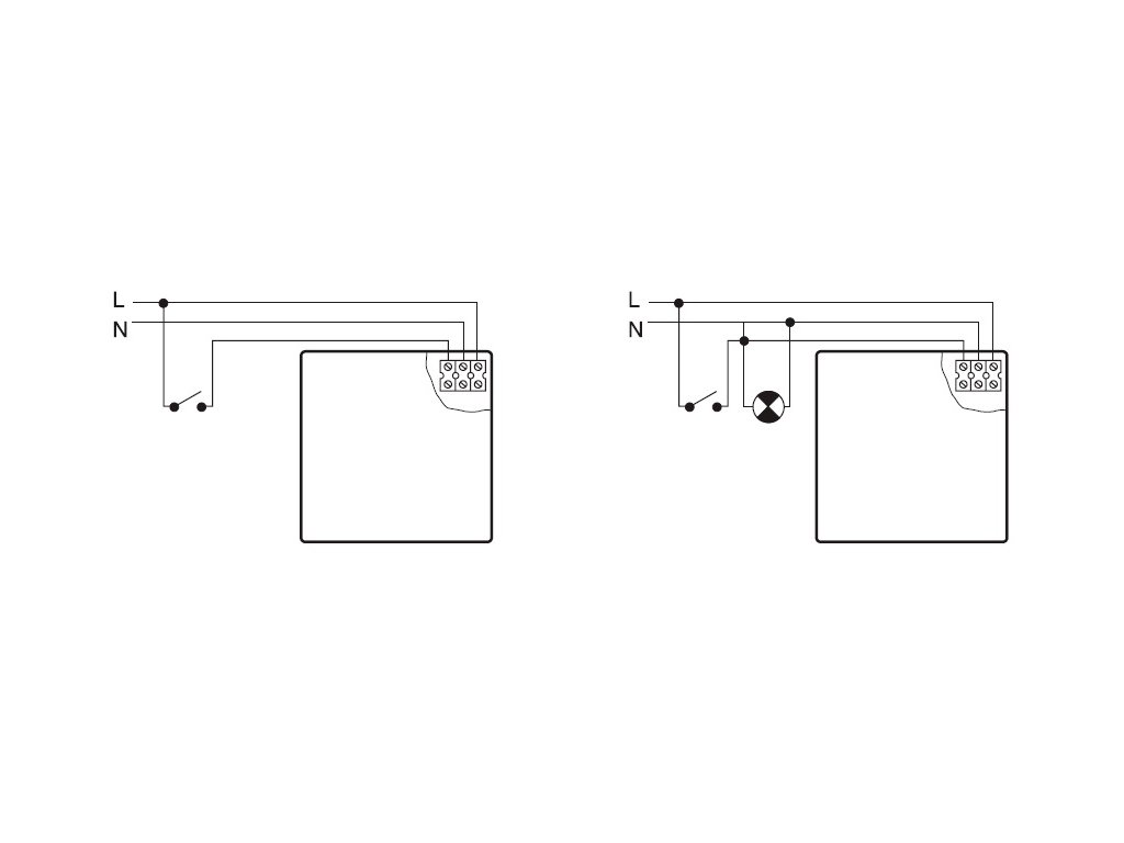 Svorkovnice je přístupná po sejmutí čelní mřížky ventilátoru. Připojení je kabelem pod omítkou.