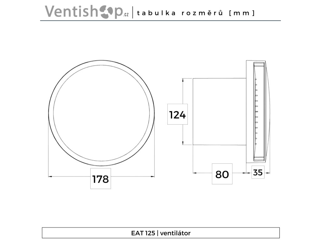Kruhový ventilátor - ⌀ 125 mm (průměr potrubí), časový doběh, barva bílá, elegantní design, voděodolnost o stupni IP X4, kuličková ložiska, AC motor, tichý chod (36 db/3m), axiální konstrukce, příkon 16 W, otáčky 2360 / min, průtok 150 m3/h, napětí 220-240V, rozměry 115 × 178 mm (Š×V), hmotnost 0,49 kg