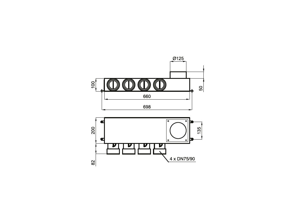 - 4 plastová hrdla o Ø 75/90 mm s těsněním a regulační klapkou s vnější aretací