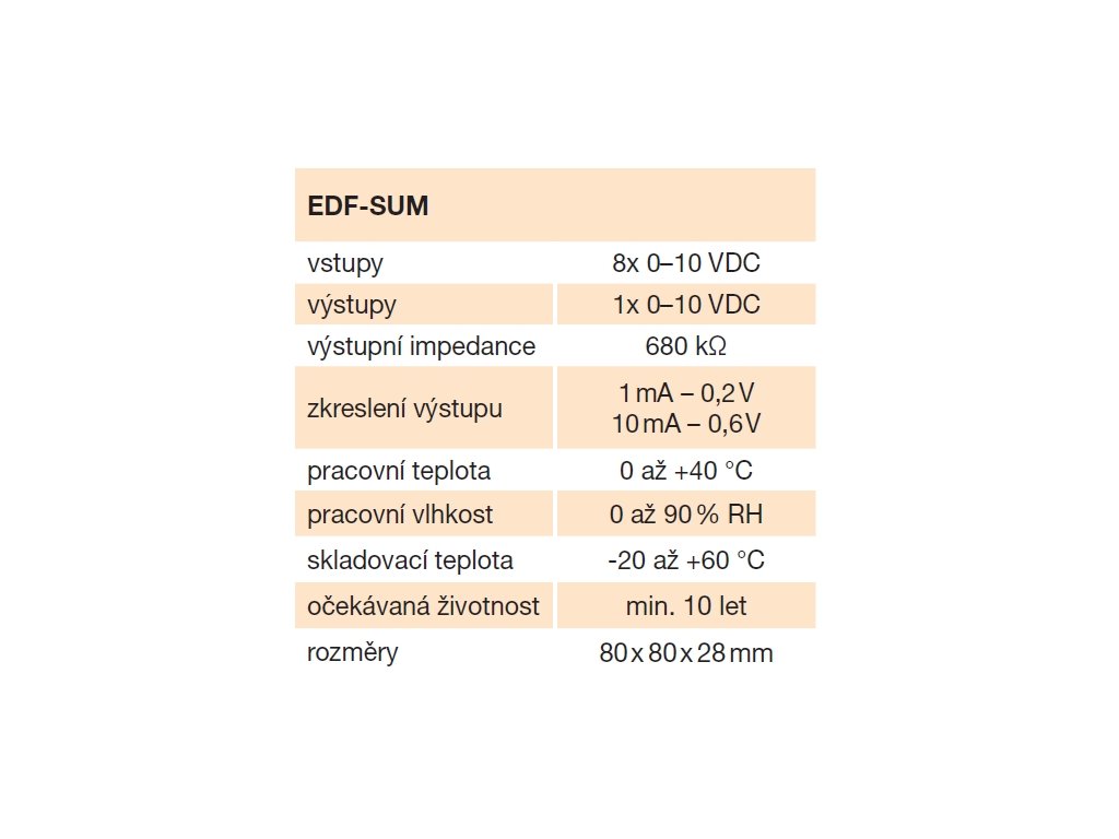 EDF-SUM zjednodušuje monitorování kvality vzduchu či řízení ventilace při použití více čidel. Až osm čidel je pak možno připojit na vstupy EDF-SUM, jehož výstup pak bude mít vždy hodnotu nejvyššího výstupu z připojených čidel.