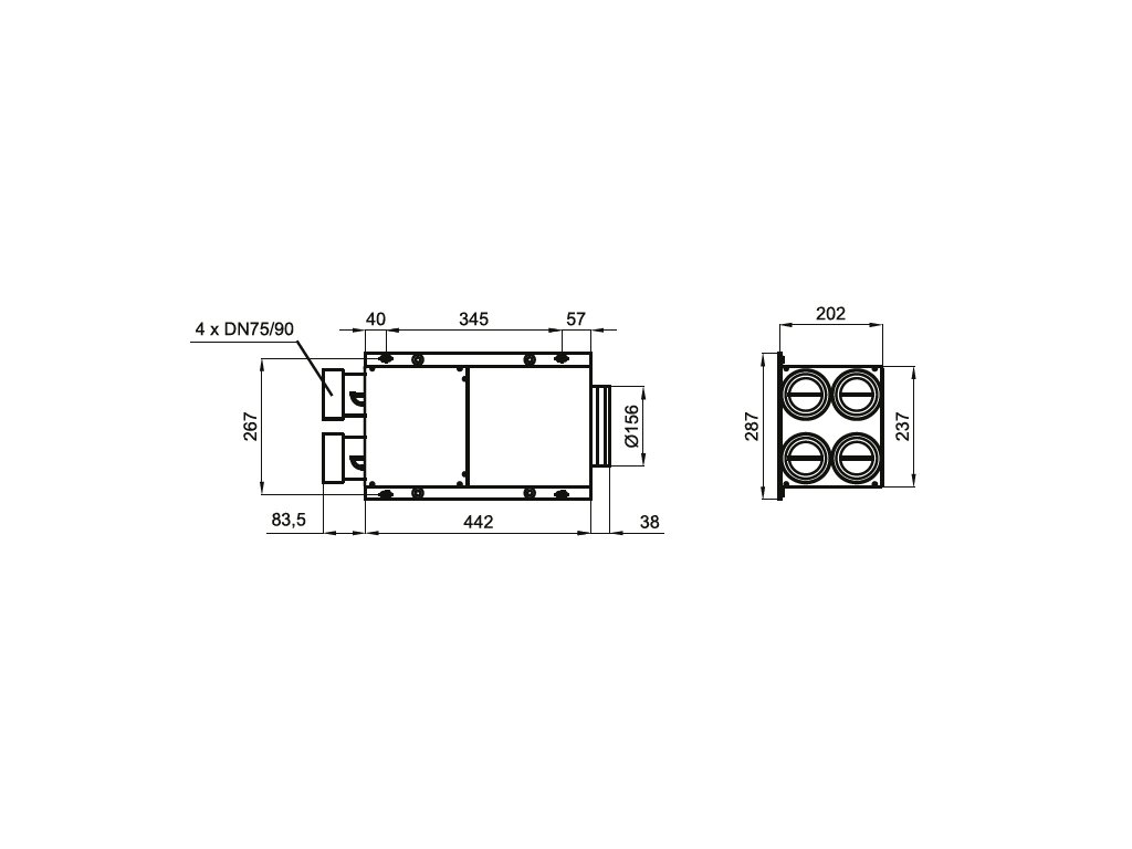 - 4 plastová hrdla o Ø 75/90 mm s těsněním a regulační klapkou s aretací