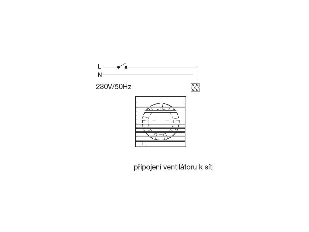Svorkovnice je přístupná po sejmutí čelní mřížky ventilátoru. Připojení je kabelem pod omítkou nebo na omítce. Svorkovnice obsahuje odlehčovací sponu proti vytržení kabelu.