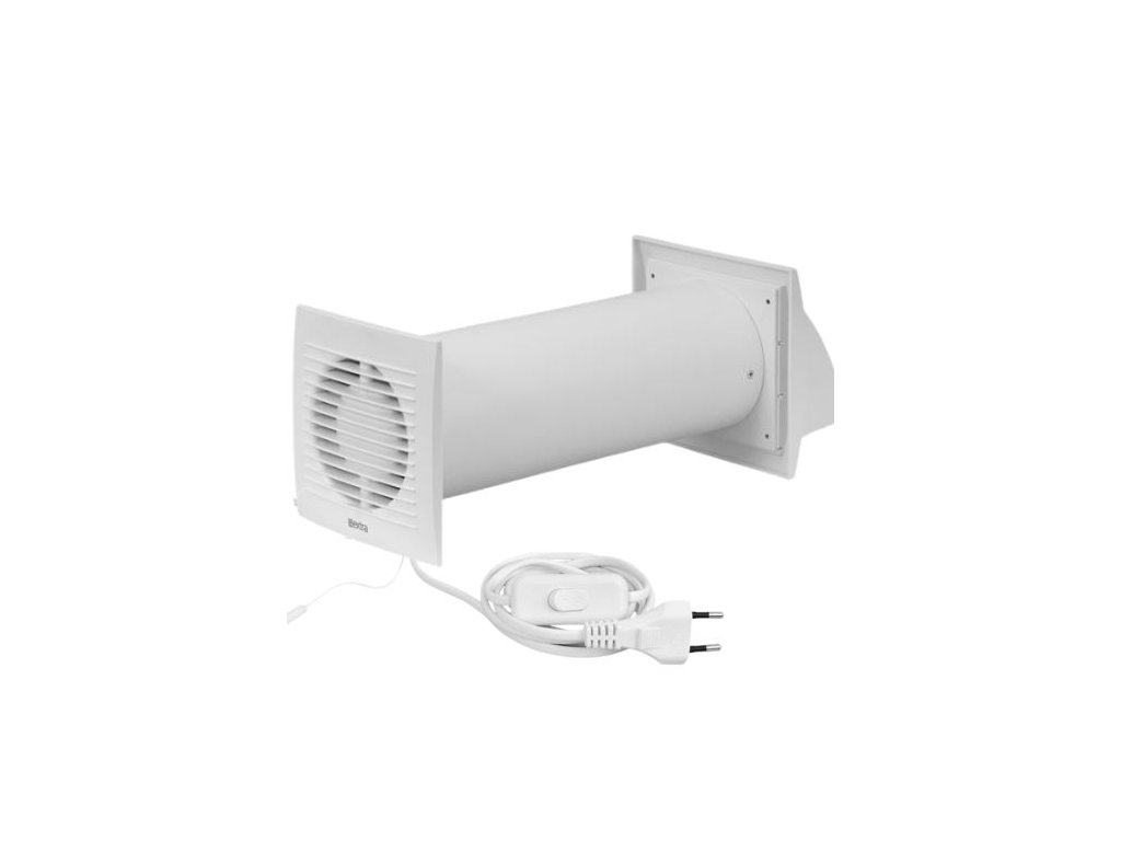 Lokální rekuperace - ⌀ 150 mm, s přívodem pro běžnou zásuvku, s ovladačem na kabelu, energetická třída A, voděodolné o krytí IP X4, 2 rychlosti, účinnost 90 % , barva bílá, průtok 53 m3/h (v režimu odsávání), průtok 27 m3/h (při rekuperaci) tepelný výměník, stupeň filtrace G1 (EU1), 2 fázový automatický chod, užívané pro (ložnice, obývací pokoje, koupelny), hlučnost 19/32 db(A), příkon 1,8 - 3,7 W (v závislosti na rychlosti), rozměry 190 × 190 mm (Š×V), hmotnost 2,5 kg