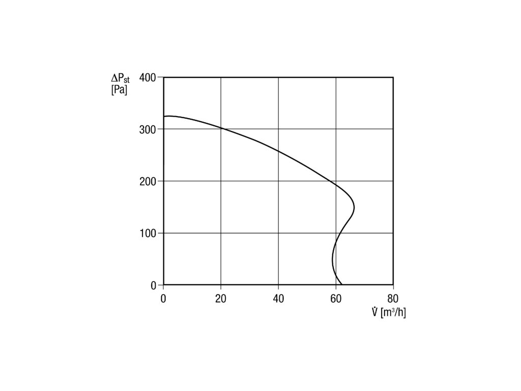 Ventilátor má vynikající technické parametry, které ho předurčují k výbornému odolávání tlakovým změnám. Důkazem je i strmá křivka, na které je vidno, že radiální konstrukce ventilátoru v kombinace s vysokým výkonem hravě odolá změnám tlaku i při delších vzdálenostech potrubí.