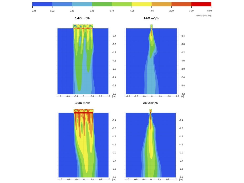 Přenese průtok až 250 m³/h (na segment, lze řetěžit) při zachování rozumné hlučnosti a nízké tlakové ztráty.