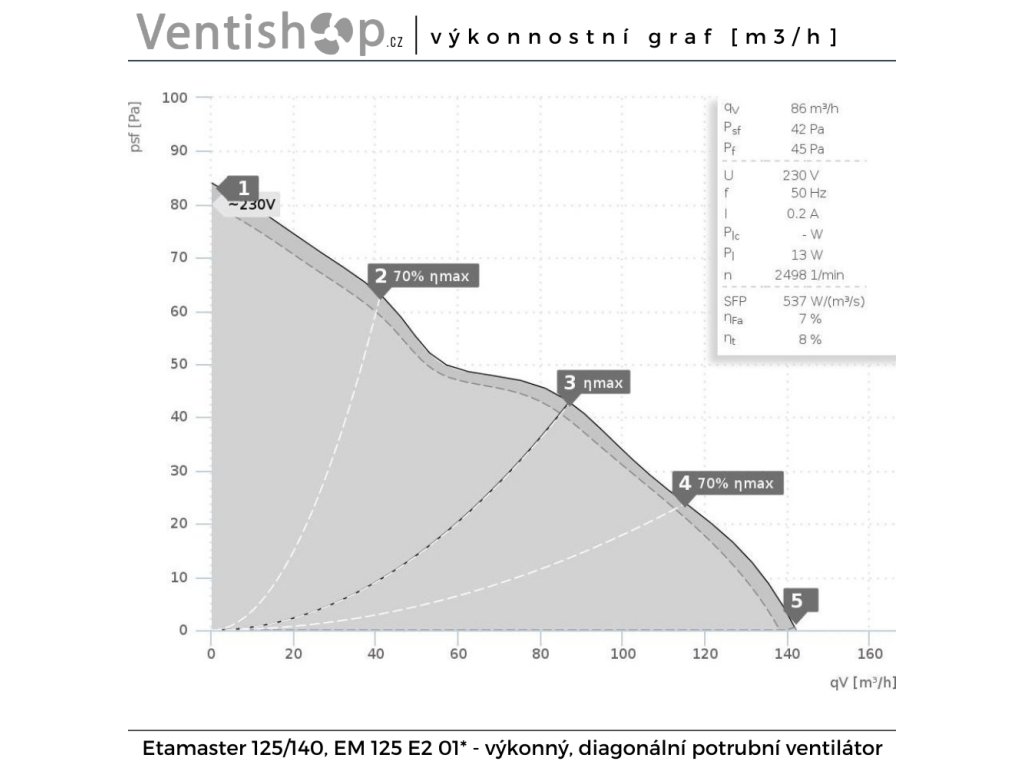 Potrubní ventilátor - ⌀ 125 mm (průměr), diagonální konstrukce, kuličková ložiska, max. průtok 140 m3/h, příkon 13 W, připojení z boku, krytí IP 44, AC motor, 1 rychlostní, plastová konstrukce, hlučnost 49 dB/A, ochrana motoru TAI, ochrana proti přehřátí, max. teplota 60 °C, proud 0,2 A, umístění (do - koupelen / toalet / kuchyní), montážní konzole součástí, rozměry 231 × 100 mm (Š×V), hmotnost 0,7 kg