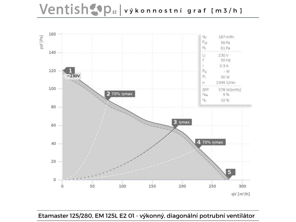 Potrubní ventilátor - ⌀ 125 mm (průměr), diagonální konstrukce, kuličková ložiska, max. průtok 280 m3/h, příkon 32 W, krytí IP 44, AC motor, 1 rychlostní, plastová konstrukce, hlučnost 55 dB/A, ochrana motoru TAI, ochrana proti přehřátí, max. teplota 40 °C, proud 0,3 A, umístění (do - koupelen / toalet / kuchyní), montážní konzole součástí, rozměry 135 × 150 mm (Š×V), hmotnost 1,2 kg
