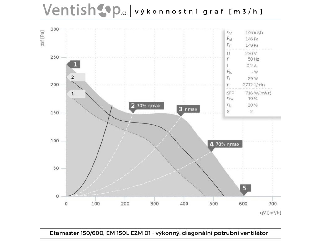 Potrubní ventilátor - ⌀ 150 mm (průměr), diagonální konstrukce, kuličková ložiska, max. průtok 615 m3/h, příkon 45 W, krytí IP 44, AC motor, 3 rychlostní, plastová konstrukce, hlučnost 50 dB/A, ochrana motoru TAI, ochrana proti přehřátí, max. teplota 40 °C, proud 0,3 A, umístění (do - koupelen / toalet / kuchyní / komerčních prostor), montážní konzole součástí, rozměry 309 × 150 mm (Š×V), hmotnost 2,5 kg