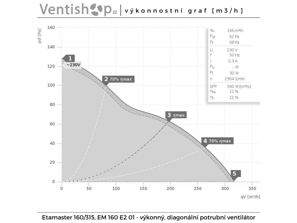 Potrubní ventilátor - ⌀ 160 mm (průměr), diagonální konstrukce, kuličková ložiska, max. průtok 315 m3/h, příkon 31 W, krytí IP 44, AC motor, 1 rychlostní, plastová konstrukce, hlučnost 51 dB/A, ochrana motoru TAI, ochrana proti přehřátí, max. teplota 40 °C, proud 0,3 A, umístění (do - koupelen / toalet / kuchyní), montážní konzole součástí, rozměry 258 × 130 mm (Š×V), hmotnost 1 kg