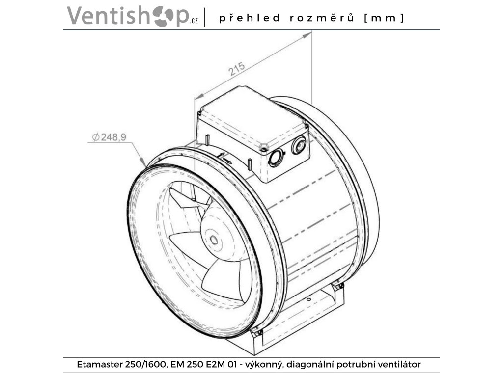 Potrubní ventilátor - ⌀ 250 mm (průměr), diagonální konstrukce, kuličková ložiska, max. průtok 1620 m3/h, příkon 170 W, krytí IP 44, AC motor, 3 rychlostní, plastová konstrukce, hlučnost 55 dB/A, ochrana motoru TAI, ochrana proti přehřátí, max. teplota 55 °C, proud 0,8 A, umístění (do - průmysl, komerční prostory, středně velké až velké místnosti), montážní konzole součástí, rozměry 215 × 250 mm (Š×V), hmotnost 5,7 kg