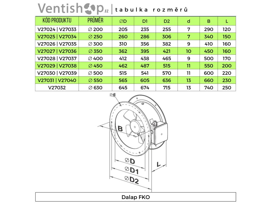 Výkonný potrubní axiální ventilátor - FKO 200, ⌀ 200, 205 mm, průtok 860 m3/h, 2300 otáček, kuličková ložiska, motorová ochrana, hlasitost 48dBA , krytí IP X4, napětí 230 V, lze regulovat, vhodné i do kuchyní, skleníků, kin, chat, sprch, garáží, obchodů, skladů, pěstíren, průmyslových/komerčních prostor a dalších, rozměr 290 mm (délka), hmotnost 1,95 kg