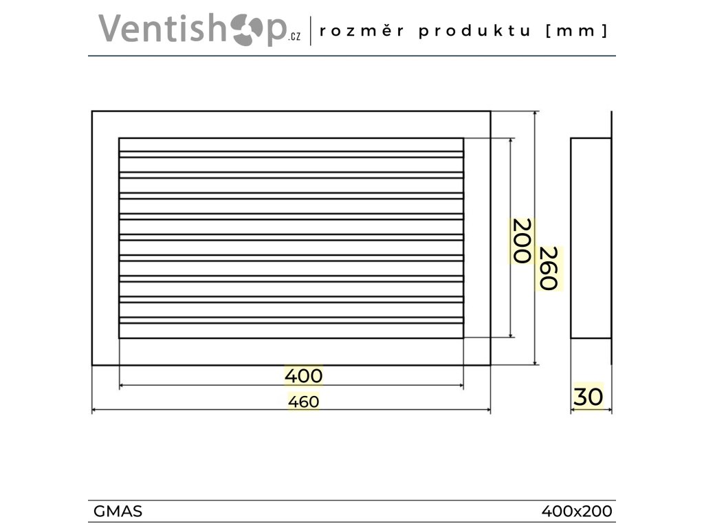 GMASs 400x200 hranatá hliníková větrací mřížka s nastavitelnou žaluzií, šedá