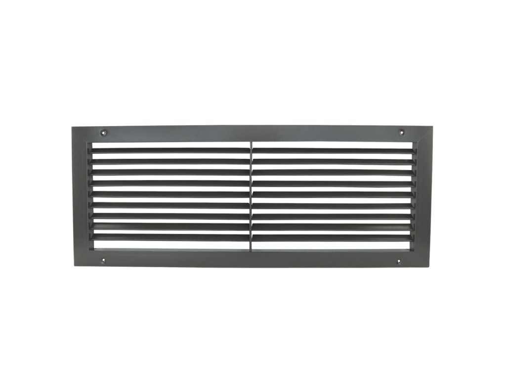 Ventilační mřížka s žaluzií - příruba 600x300 mm, barva šedá (stříbrná), vzorník RAL 7043, materiál hliník, kvalitní zpracování, s nastavitelnými lamelami, obdélníkový tvar, předpokládané umístění (interiér - domů i průmyslových budov), elegantní design, snadná instalace, odolná konstrukce, rozměry (+ rám) 660×360 mm (Š×V), hmotnost ~0,5 kg