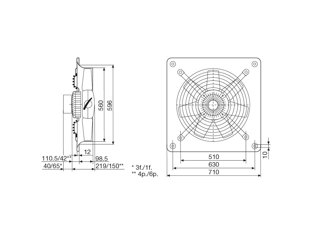 Směr otáčení je možno měnit. Se standardním oběžným kolem klesne při opačném směru otáčení průtok o cca 30%. Průtok vzdušiny je standardně od motoru k oběžnému kolu.