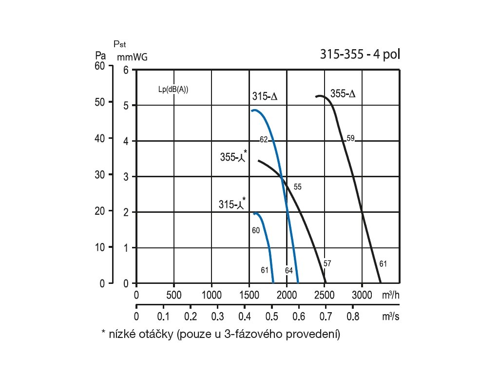 Hluk emitovaný ventilátorem je uveden v tabulkách jako hodnoty akustického tlaku ve vzdálenosti 1,5 m na straně sání a výtlaku. Pro získání hodnot akustického výkonu v oktávových pásmech je nutno k hodnotě akustického tlaku přičíst korekční faktor v dole uvedených tabulkách.