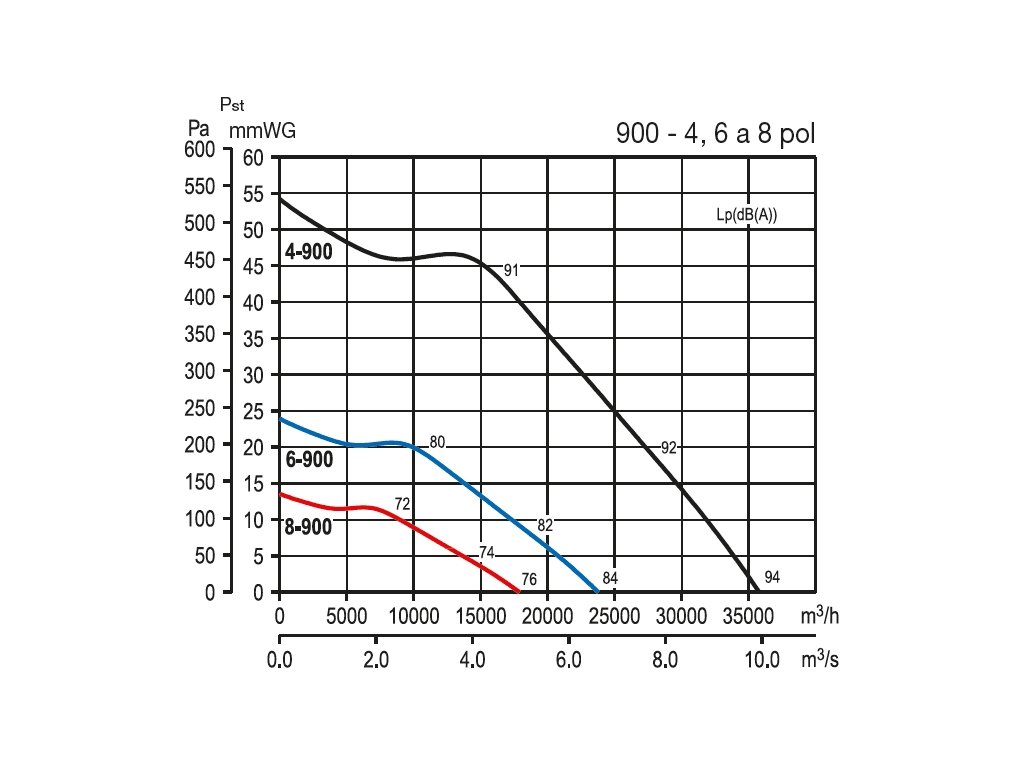 Hluk emitovaný ventilátorem je uveden v tabulkách jako hodnoty akustického tlaku ve vzdálenosti 1,5 m na straně sání a výtlaku. Pro získání hodnot akustického výkonu v oktávových pásmech je nutno k hodnotě akustického tlaku přičíst korekční faktor v dole uvedených tabulkách.