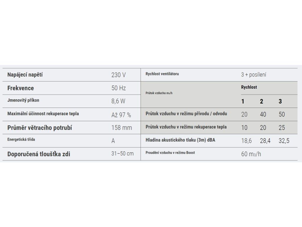 Lokální rekuperace - ⌀ 160 mm (průměr), průtok 10-25 m3/h (rekuperování), průtok 20-50 m3/h (odvětrávání), tichý provoz, ovládání (na panelu / dálkové / Wi-Fi), možnost chytrého Wi-Fi ovládání, 3 rychlosti + režim BOOST (60 m3/h), délka potrubí (délka 310 - 500 mm), spotřeba max. 8,6 W, účinnost až 97 %, barva bílá, filtrace F7 + předfiltr, užívané do (domů, bytů - ložnice, obývacího pokoje, koupelny), hlučnost 18,6 - 32,5 db(A), účinný tepelný výměník, hmotnost ~ 7 kg