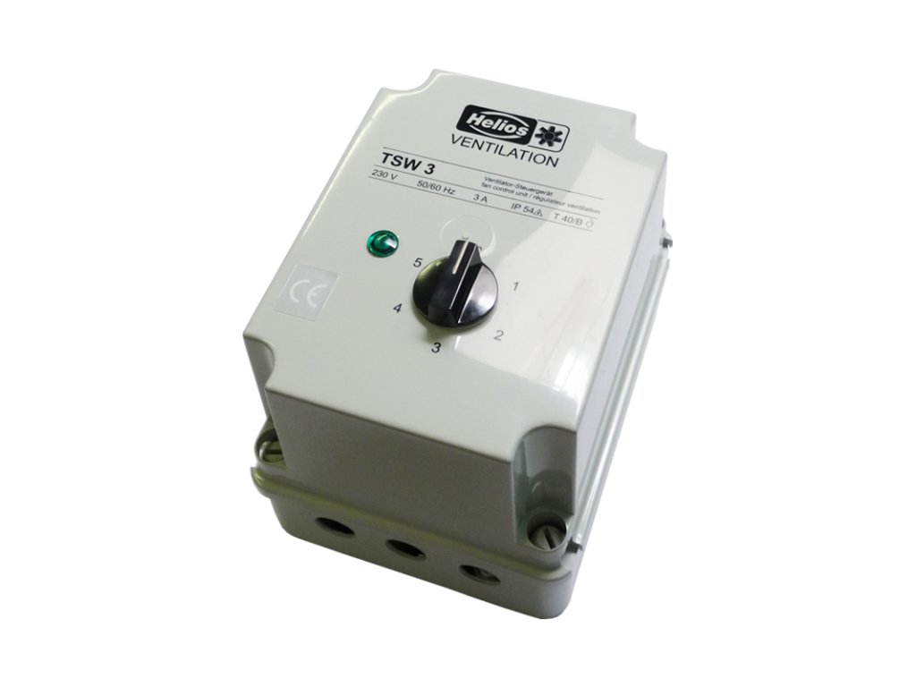 Pětistupňový trafo regulátor otáček pro ventilátory s napájecím napětím 230V. Otáčky ventilátoru se regulují změnou výstupního napětí pomocí přepínače na přední straně transformátoru. Je nastavitelný pro řízení výkonu všech ventilátorů na střídavý proud 1~ . Čtyři sekundární napětí v odstupňování ventilátorů 5 výkonnostních stupňů 80/100/130/170 a 230V (plné síťové napětí). Na jeden řídící přístroj může být napojeno více, i různých, ventilátorů až po hodnotu zatížení jmenovitého proudu. Výhodný poměr cena/výkon, nízká poruchovost, nízkoztrátový provoz ventilátoru bez rušivého hluku. Má robustní ISO-kryt, světle šedý, z umělé hmoty odolné proti nárazu, krytí IP 54. Zabudovaný ukazatel provozního módu pomocí kontrolky. Transformátor je impregnovaný ponorem T 40 E. Maximální přípustná okolní teplota +40°C. Možno používat hned po dodání, jednoduché připojení ke svorkovnici.