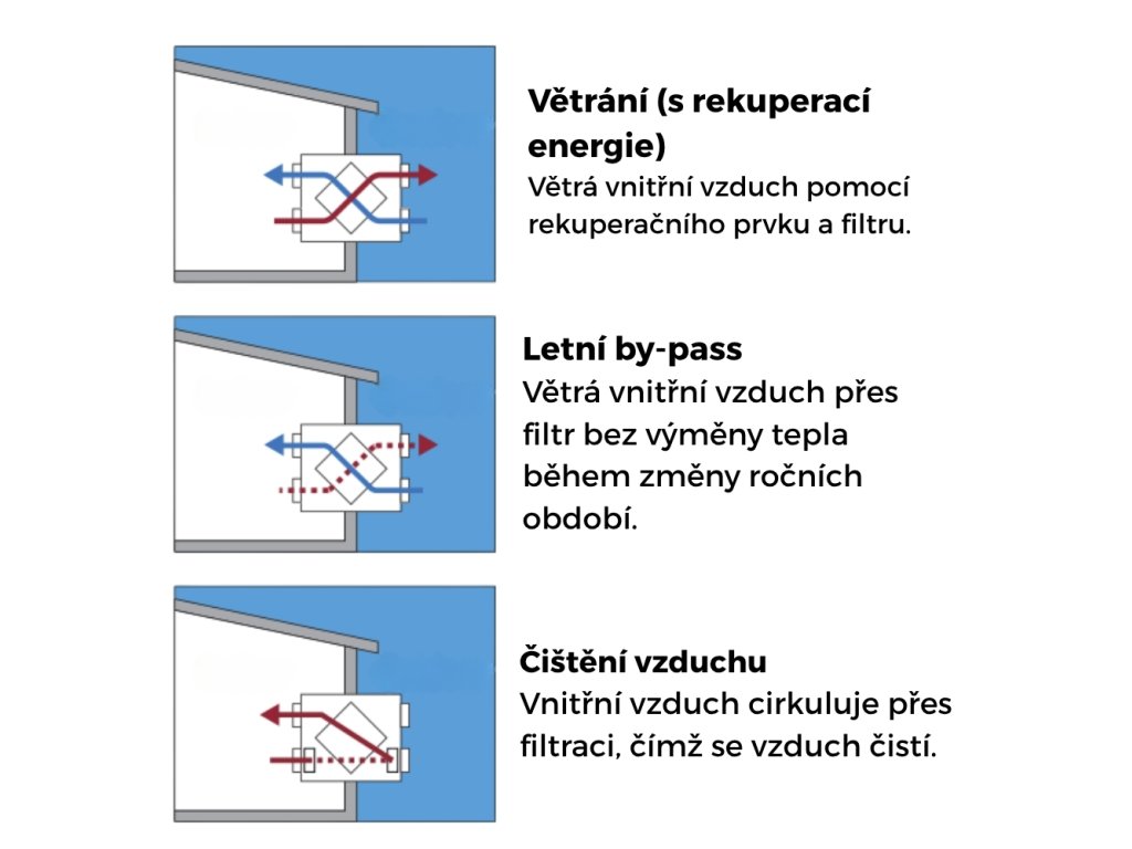 V horkých dnech lze aktivovat letní bypass, který větrá bez aktivovaného tepelného výměníku. Výsledkem je příjemnější klima v letních dnech i bez klimatizace.