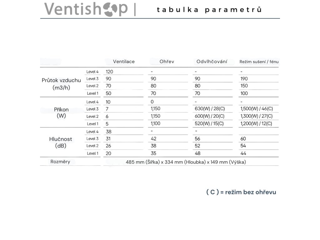- Plní funkci ventilátoru, odvlhčovače, horkovzdušného ohřívače, fénu