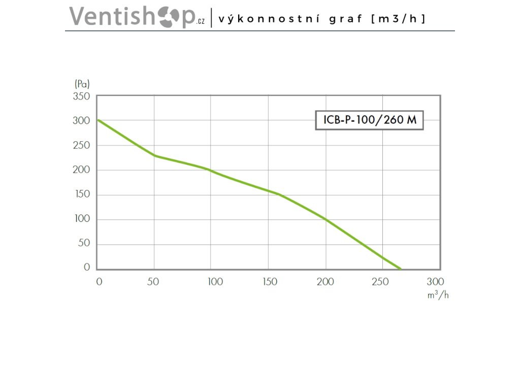 Ventilátor do potrubí - ⌀ 100 mm (průměr), radiální konstrukce, snadno překonává tlakové ztráty, průtok 262 m3/h, příkon 51 W, krytí IP 44, AC motor, vysoká účinnost při nízké hladině hluku, 1 rychlostní, materiál ocel. plech, hlučnost 40,6 dB/A, ochrana proti přehřátí, max. teplota 60 °C, proud 0,24 A, umístění (do - koupelen / toalet / kuchyní / komerčních prostor), rozměry 285 × 244 mm (Š×V), hmotnost 3,1 kg
