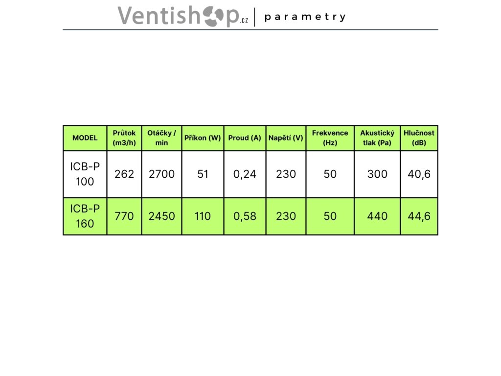 ICB-P nabízí kvalitní konstrukci s radiální konstruovanými lopatkami. Kombinuje vysokou účinnost, nízké tlakové ztráty a nízkou hladinu hluku.