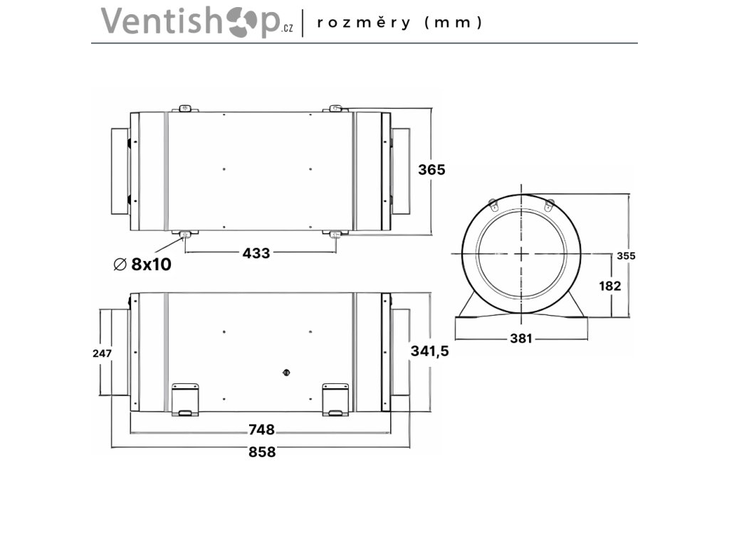 Tichý ventilátor do potrubí - ⌀ 250 mm (průměr), diagonální konstrukce, úsporný EC motor, příkon 175 W, průtok 1764 m3/h, krytí IP 44, tepelná ochrana (+ auto reset), akusticky izolované, napětí 230 V, materiál ocel. plech, regulovatelné (plynule 0-10 V signálem), hlučnost 48 dB, ochrana proti přehřátí, max. teplota 60 °C, proud 1,6 A, umístění (do - bytů / obchodů / kanceláří / komerčních prostor / domů), rozměry 858 × 365 mm (Š×V), hmotnost 11,9 kg