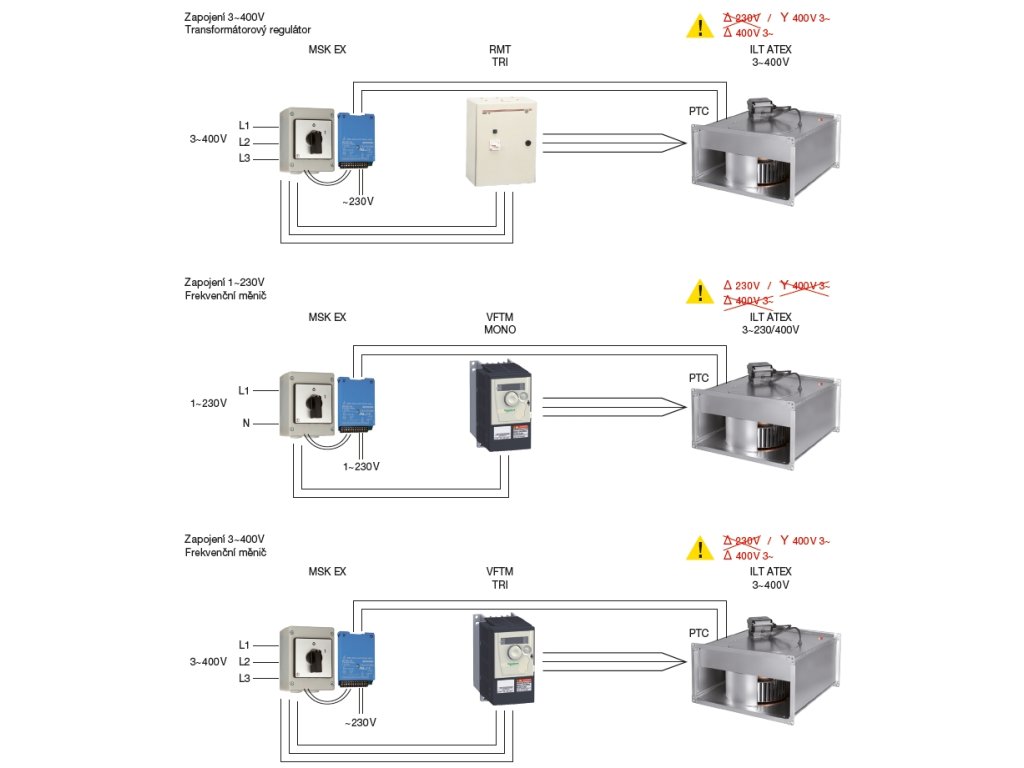 Pozor, ventilátory jsou ve speciálním provedení pro ČR. Nelze použít náhradní díly standardně dodávané výrobcem či obchodními organizacemi. Pro osazení jistících prvků a tím bezpečný provoz ventilátorů jsou rozhodujícím podkladem hodnoty In, Ia/In a te uvedené v certifikátech ventilátorů. Po dodání ventilátoru je nutné tyto hodnoty pečlivě zkontrolovat.Skříň