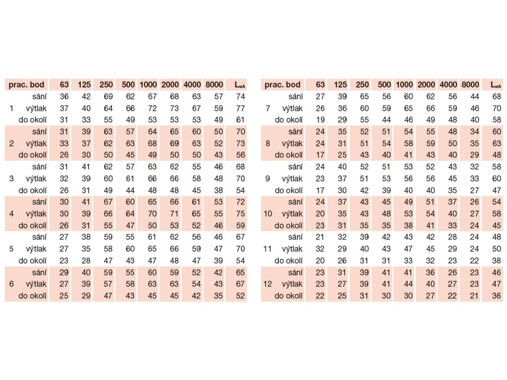 Hluk emitovaný ventilátorem je uveden v tabulkách pro čtyři části výkonové křivky.