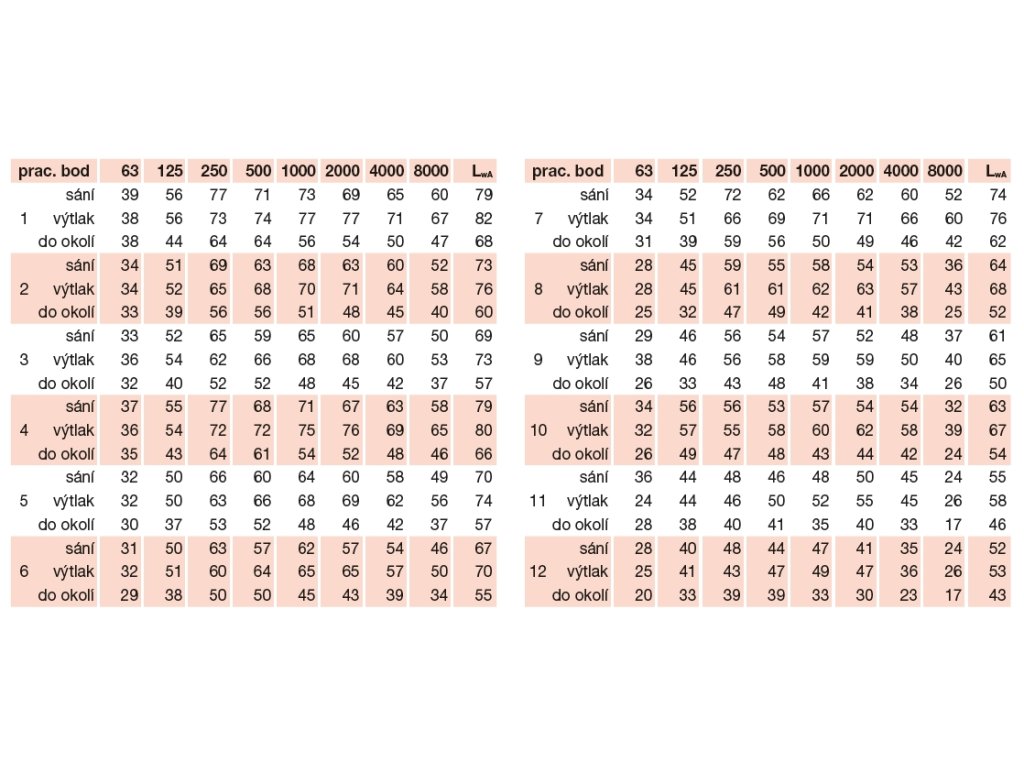 Hluk emitovaný ventilátorem je uveden v tabulkách pro čtyři části výkonové křivky.