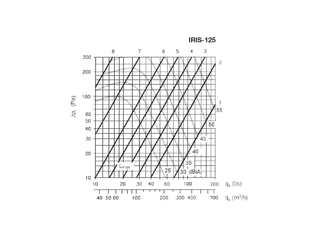 Clona IRIS může být snadno použita pro měření průtoku vzduchu. Přesný ovládací mechanismus zaručuje definované rozměry otevření odpovídající měřící stupnici. Každá clona je opatřena odběry pro připojení manometru pro měření tlakové diference (pm), která se dá přímo použít k odečtení rychlosti proudění z pracovních charakteristik uvedených na cloně nebo v tištěném podkladu dodávaném s clonou. Diagramy uvedené zde v katalogu jsou určeny pro volbu vhodné velikosti clony, ne pro stanovení průtoku. Průtok vzduchu se dá snadno regulovat pomocí ovládací rukojeti (u velikostí 80–315) nebo pootočením regulační matice (u velikostí 400–800).