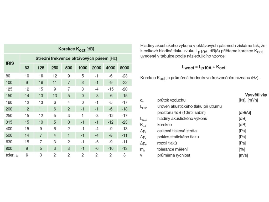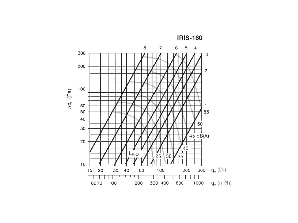 Clona IRIS může být snadno použita pro měření průtoku vzduchu. Přesný ovládací mechanismus zaručuje definované rozměry otevření odpovídající měřící stupnici. Každá clona je opatřena odběry pro připojení manometru pro měření tlakové diference (pm), která se dá přímo použít k odečtení rychlosti proudění z pracovních charakteristik uvedených na cloně nebo v tištěném podkladu dodávaném s clonou. Diagramy uvedené zde v katalogu jsou určeny pro volbu vhodné velikosti clony, ne pro stanovení průtoku. Průtok vzduchu se dá snadno regulovat pomocí ovládací rukojeti (u velikostí 80–315) nebo pootočením regulační matice (u velikostí 400–800).